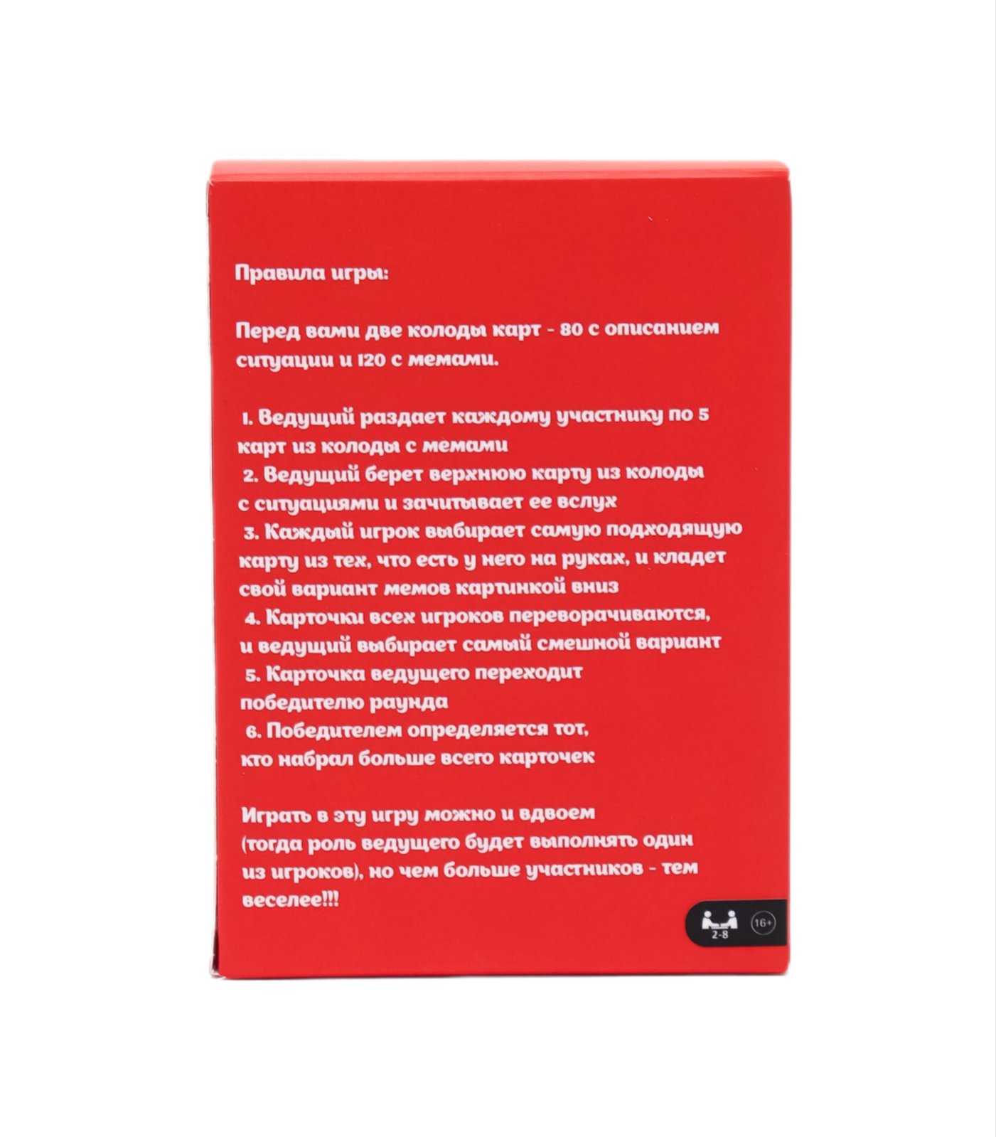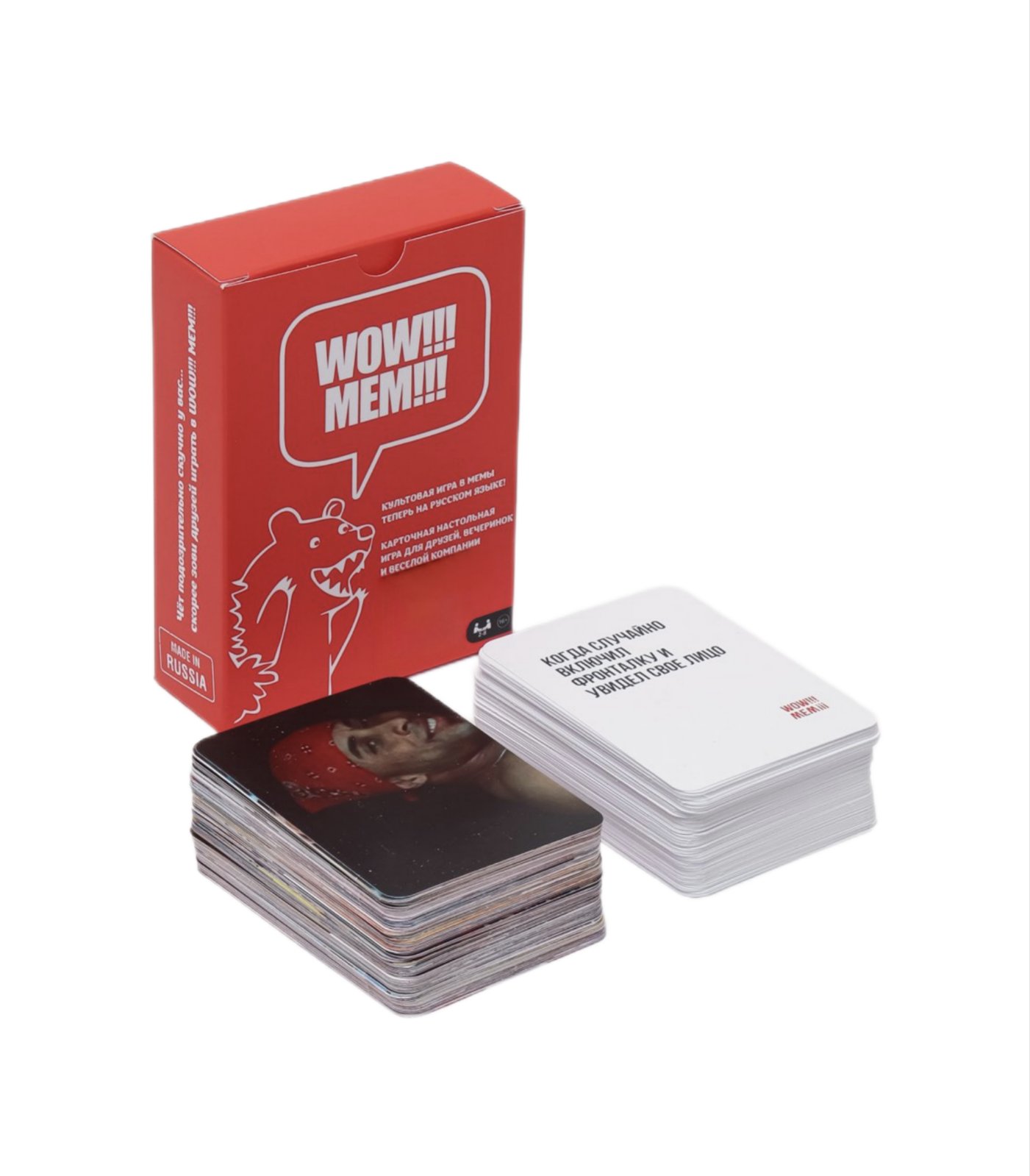 Какой ты мем — карточная игра для подростков и взрослых.В наборе 80 карточек с ситуациями и 120 с мемами. Простые правила на коробке и QR-код для новых карточек Для компании от 2 до 10 человек.Возраст 16+ без нецензурной лексики с молодежным сленгом Хит TikTok и оригинальный подарок друзьям.Прочные качественные материалы.Играйте подбирайте самые смешные мемы и создавайте свой юмор вместе с друзьями Мемология - отдельная мегапопулярная категория современного юмора. Настольную игру в мемы вы и ваши друзья полюбите после первой сыгранной партии и не спутаете ни с чем! Культовая игра WOW!!!MEM!!! обязательно понравится тем, кто любит поиграть в UNO, Бункер, Дженга, шахматы, доббль, покер, твистер, свинтус, крокодил и монополию.