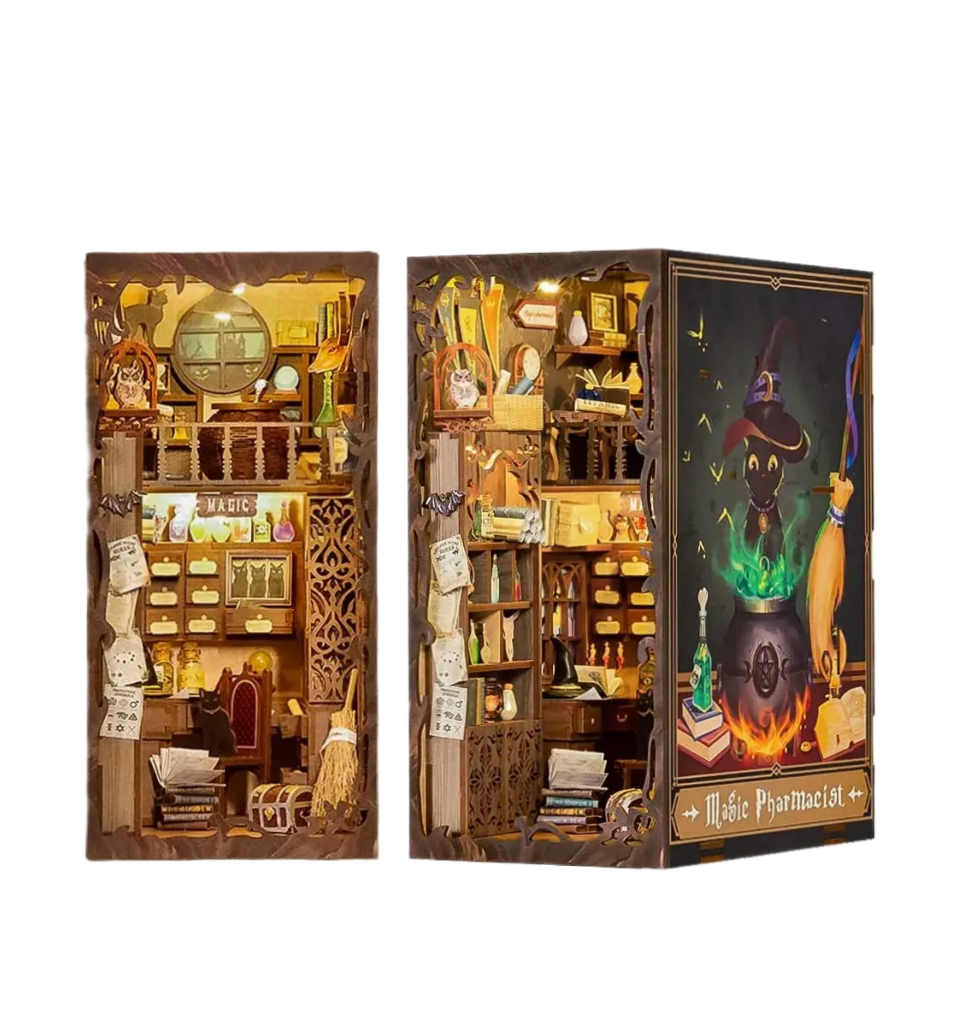 Набор DIY Magic Pharmacist — это миниатюрный 3D-пазл для самостоятельной сборки в формате книжного уголка. Изготовлен из качественной и экологичной древесины, детали точно вырезаны лазером и легко соединяются между собой. В комплекте есть подробная пошаговая инструкция, поэтому сборка проходит просто и увлекательно.Модель оснащена LED-подсветкой с датчиком движения, которая включается при приближении. Готовый книжный уголок станет стильным украшением полки или оригинальным подарком, развивающим внимательность, усидчивость и творческое мышление.