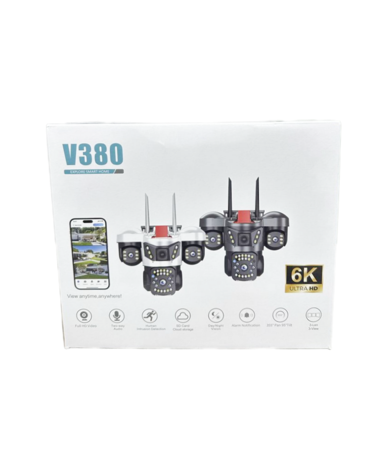Камера V380 — современное решение для умного дома, позволяющее контролировать пространство в любое время и из любого места. Модель оснащена тремя объективами, обеспечивающими обзор с трёх ракурсов, а также функцией панорамирования и наклона для максимального охвата помещения.Поддержка сверхчёткого разрешения до 6K Ultra HD обеспечивает детализированное изображение, а двусторонняя аудиосвязь позволяет не только слышать происходящее, но и общаться через камеру. Интеллектуальное обнаружение человека отправляет тревожные уведомления при подозрительной активности. Камера поддерживает дневное и ночное видение, а запись может вестись как на SD-карту, так и в облачное хранилище.