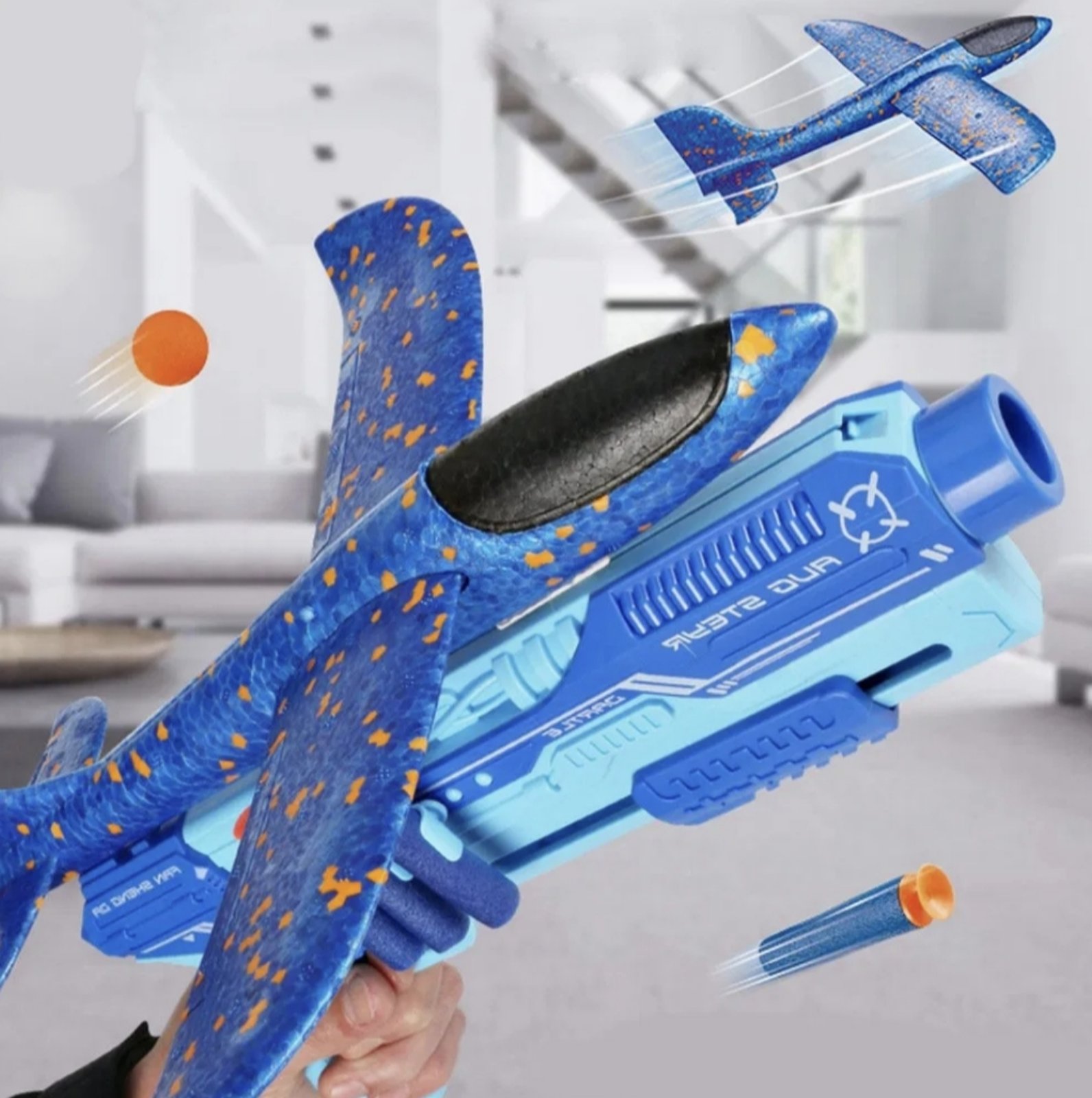 Многофункциональный пистолет-самолётик Shoot play ser 5в1: стреляет мягкими пулями до 15 м + запускает летающий самолётик-планер! Сам светится — яркие световые эффекты для игр днём и вечером. Безопасно и весело!