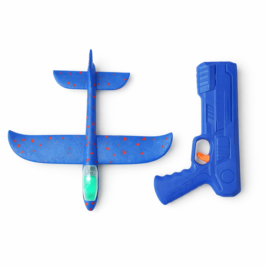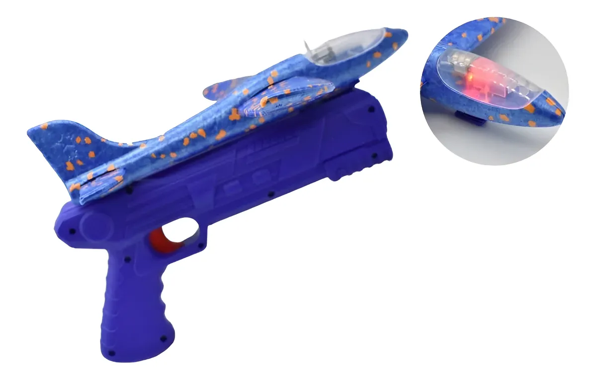 Весёлая детская игрушка: пистолет запускает пенопластовый самолётик с яркой LED-подсветкой в носовой части. Просто вставь, прицелься, стреляй — летит до 20 метров! Безопасный мягкий материал, развивает меткость и координацию. Отличный подарок для детей 3+ лет.
