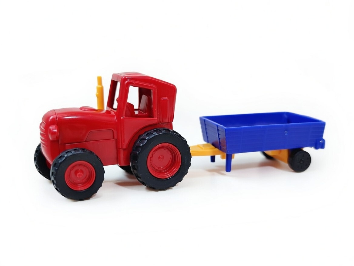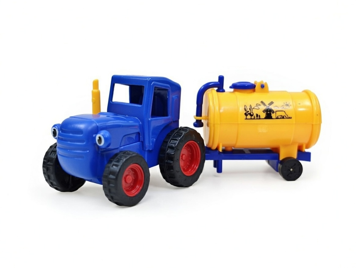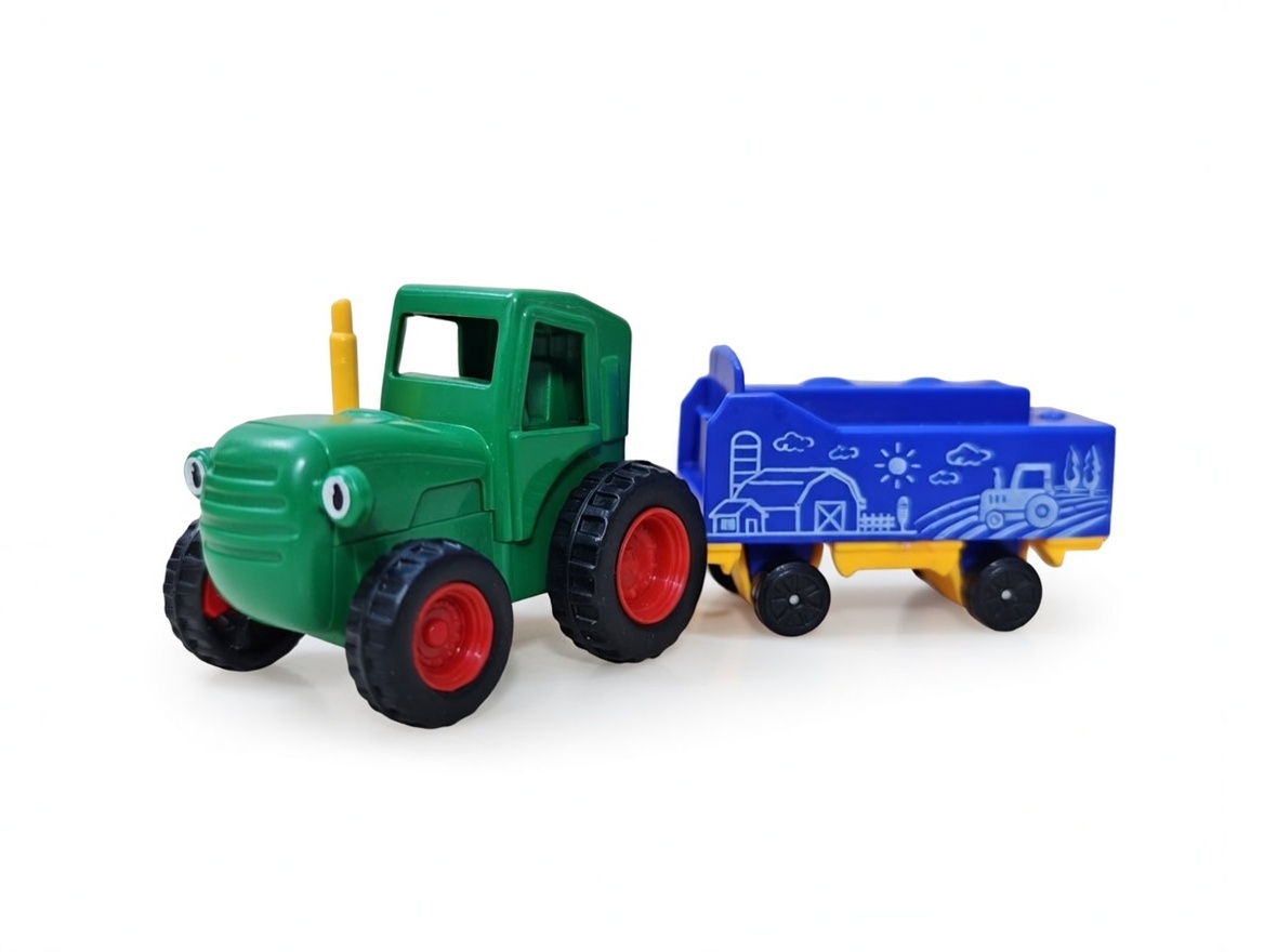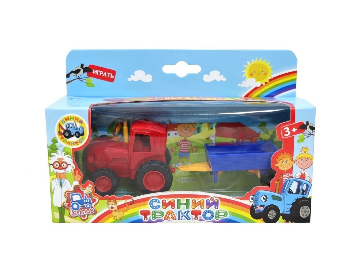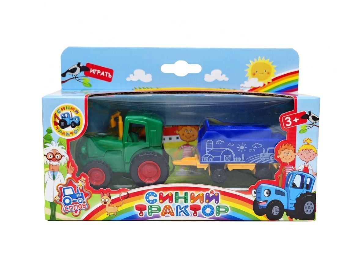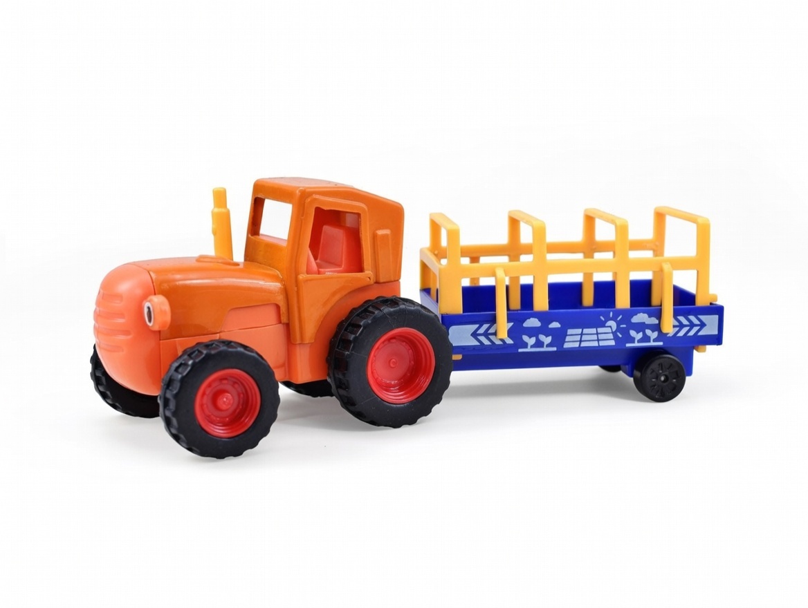 Яркий пластиковый трактор оранжевого цвета с отцепляемым синим прицепом из мультсериала «Синий Трактор». Подходит для ролевых игр на ферме, перевозки фигурок животных. Развивает воображение и моторику. Упаковка с героями мультфильма, возраст 3+.