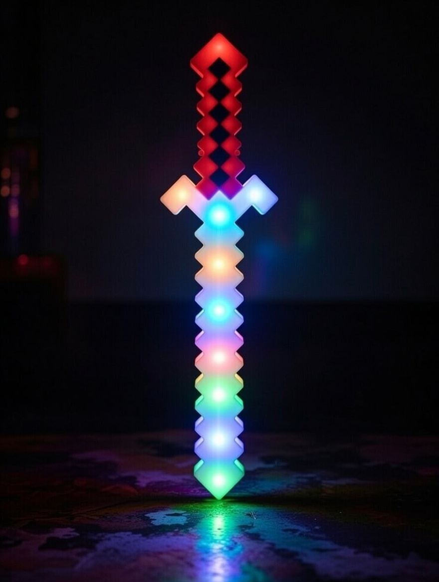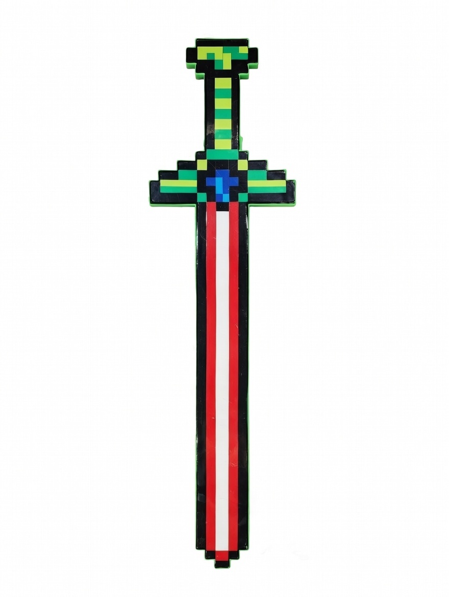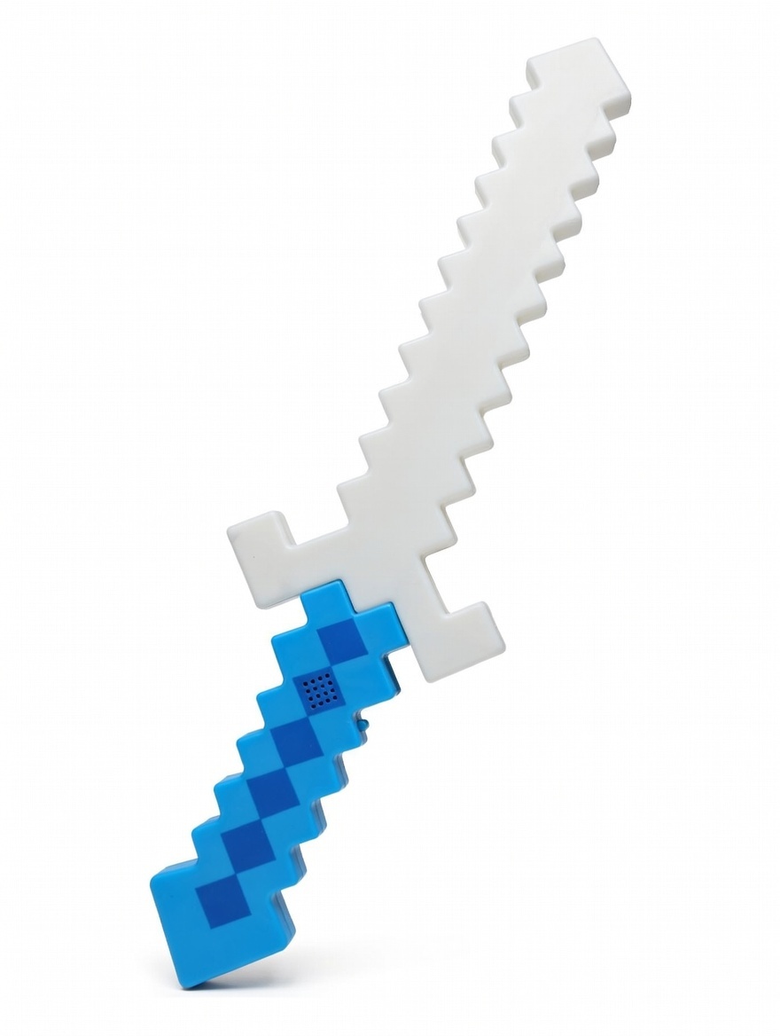 Пластиковый пиксельный меч (красный + синий/чёрный дизайн), мигает разноцветными LED (красный, синий, зелёный, голубой). При движении или нажатии — звуки ударов и боевые эффекты из Minecraft. Лёгкий, безопасный.