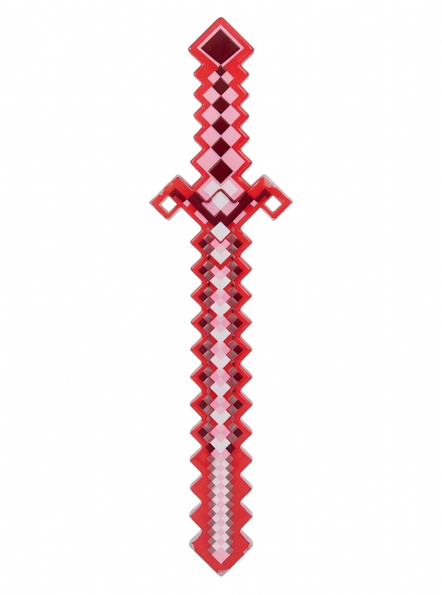 Пластиковый пиксельный меч (красный + синий/чёрный дизайн), мигает разноцветными LED (красный, синий, зелёный, голубой). При движении или нажатии — звуки ударов и боевые эффекты из Minecraft. Лёгкий, безопасный.