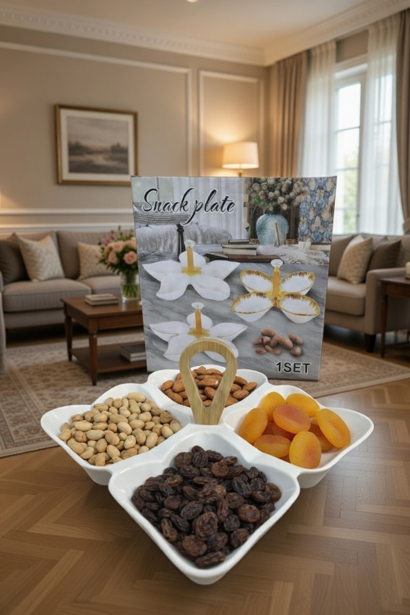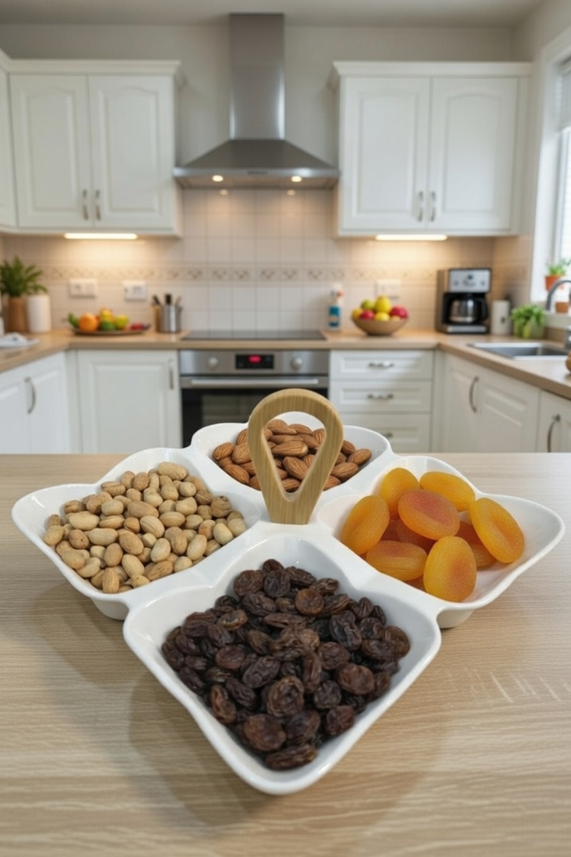 Тарелка-менажница "Четыре в одном" (260) Компактная и в тоже время вместительная, выполненная из качественной керамики и покрытая белоснежной глазурью. Четыре отсека тарелки, разнообразят сервировку вашего стола. Отлично подойдёт для орешков, снеков или сухофруктов.