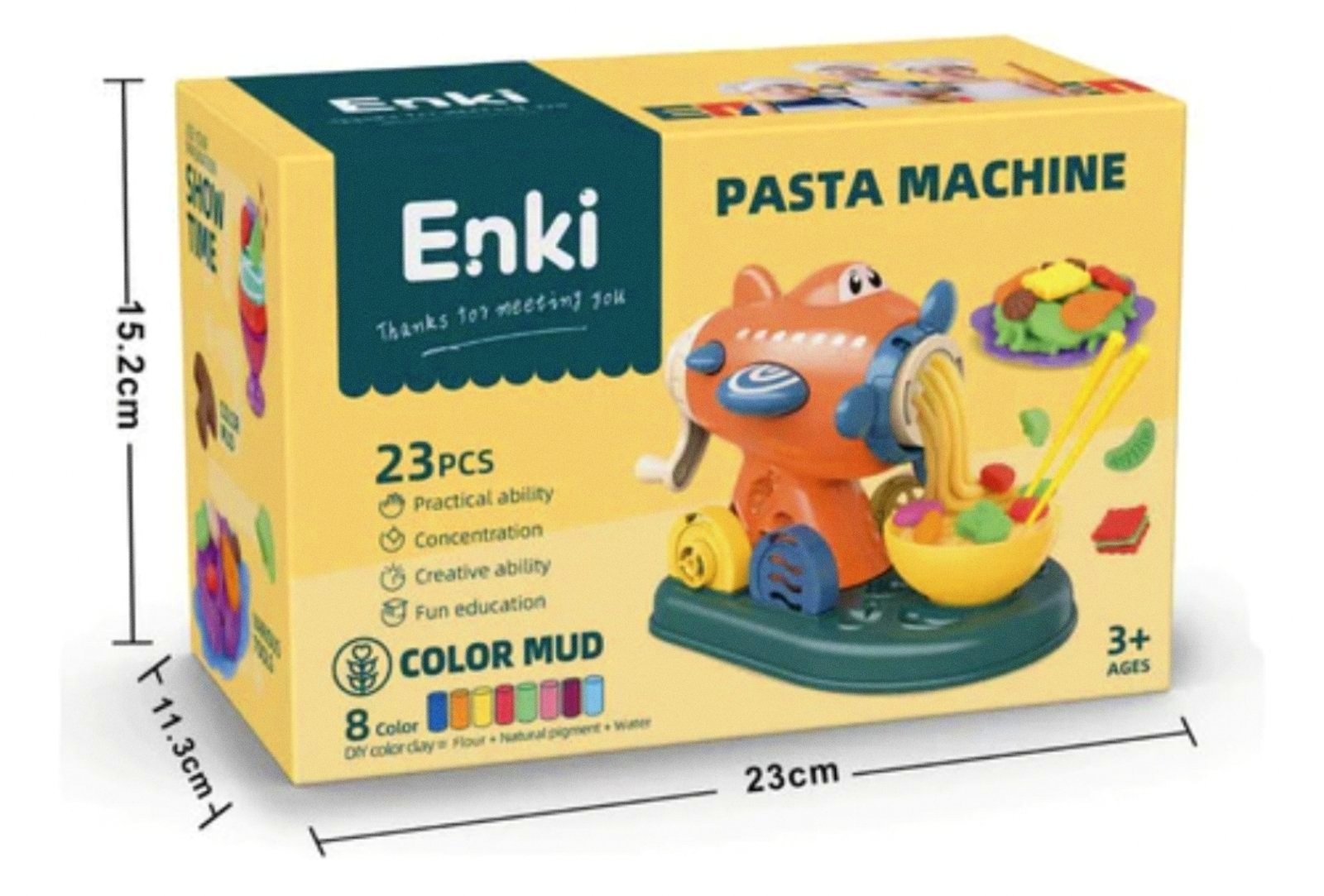 <p>Игрушечный набор мясорубка для пластилина — резвящая игрушка для детей от 3 лет. В комплекте: мясорубка 20×12×15 см с 4 сменными насадками, 2 тарелки, блюдо, ваза, овальная форма, 2 палочки для еды, пластиковые столовые приборы (ложка, вилка, нож), 8 ярких цветов пластилина.Пластилин мягкий, не прилипает к рукам, легко прокатывается по механизму, цвета хорошо смешиваются. Ребенок сможет клеить макароны, спагетти, печенье, десерты и другие «блюда».Развивает мелкую моторику, фантазию, воображение, цветовое восприятие, внимание и настойчивость. Отличный подарок для мальчиков и девочек на день рождения или Новый год.</p><p>Характеристики</p><ul><li>Enki EK6027</li><li> мясорубка для пластилина 20 х 12 х 15 см с платформой;</li><li>4 насадки на мясорубку 4 х 4 х 1 см;<br></li><li>2 тарелки 8,5 х 8,5 х 0,5 см;<br></li><li>блюдо 6,5 х 6,5 х 3 см;<br></li><li>вазочка 4,5 х 4,5 х 3,5 см;<br></li><li>овальная форма;<br></li><li>2 палочки 8 см;<br></li><li>пластиковые столовые приборы в ассортименте (ложка 7 см, вилка/нож 7,5 см);<br></li><li> пластилин - 8 цветов.<br></li><li>Размеры упаковки: 24 × 17 × 12 см</li><li>Вес с упаковкой: 426 г</li></ul>