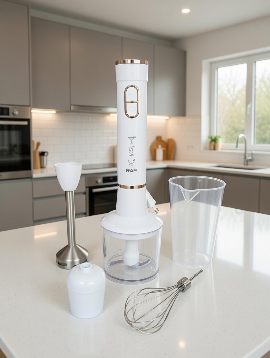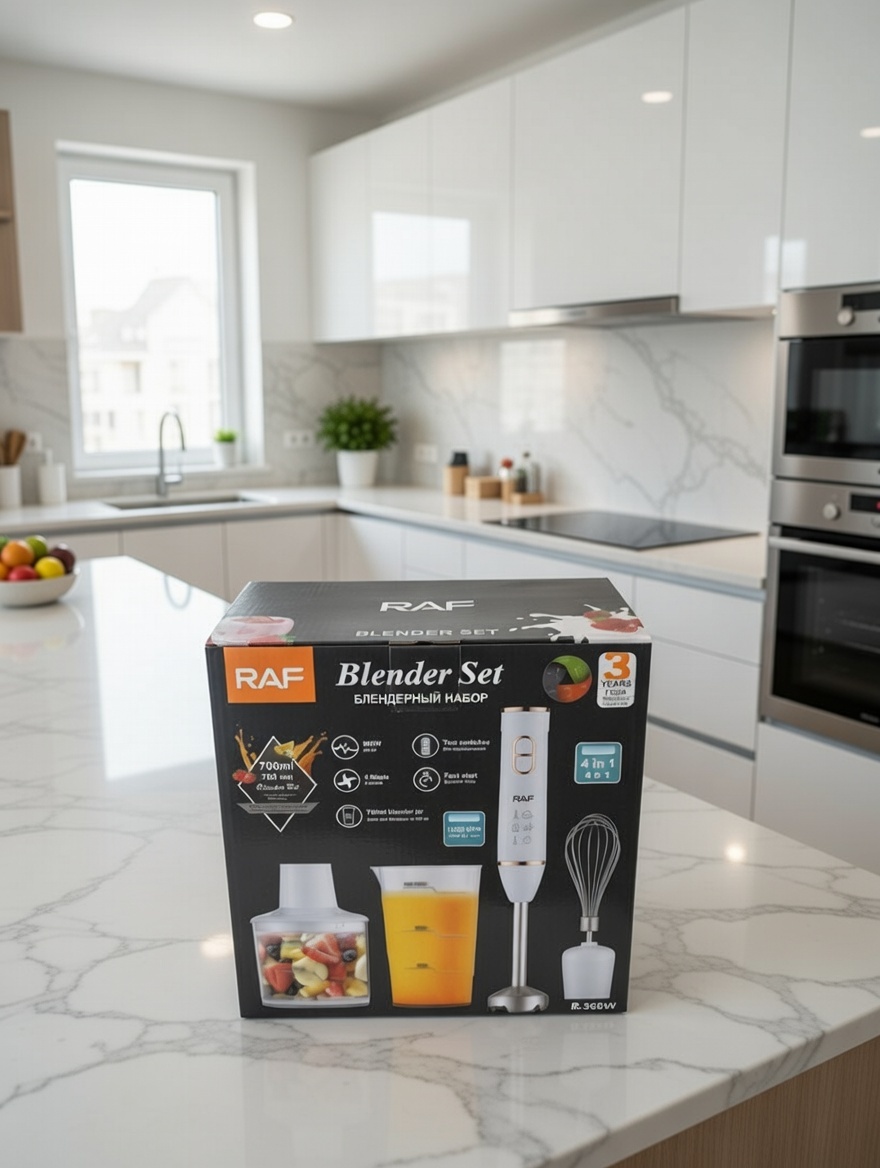 Блендерный набор RAF R.368W (4 в 1) Компактный и универсальный заменяет несколько приборов. Низкий уровень шума. Подходит для приготовления смузи, крем-супов, соусов, майонеза, детского питания, фарша, измельчения орехов/овощей/мяса. Многофункциональный кухонный набор, который сочетает в себе сразу несколько приборов: погружной блендер, измельчитель, венчик для взбивания и мерный стакан (или кувшин для смешивания). Эргономичный дизайн, удобная ручка, легко разбирается и моется.