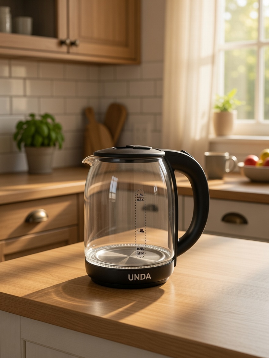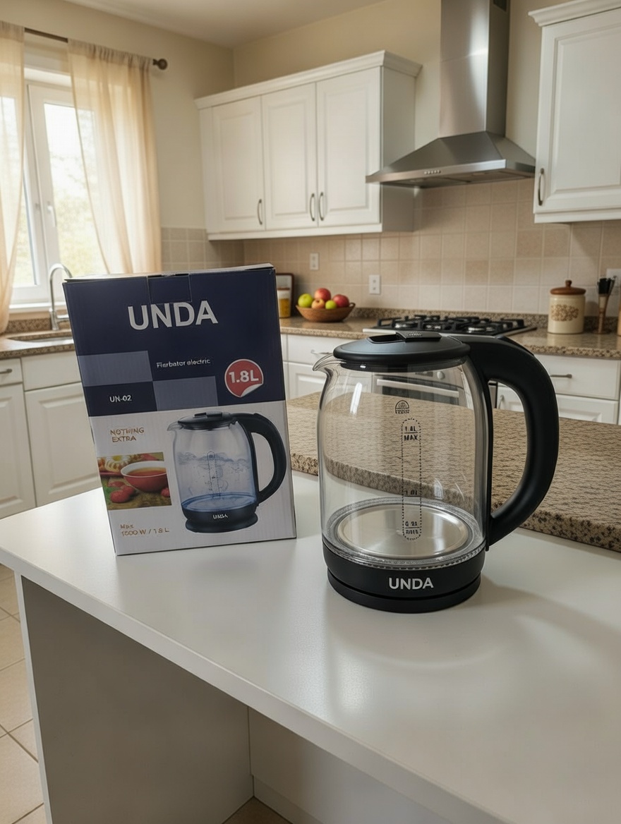 Электрочайник UNDA (UN-02) - прибор, которым приятно пользоваться: электрочайник с коробкой от перегрева. Выполнен из закалённого и термостойкого стекла. Компактный и сдержанный дизайн. Быстрый и знаменитый. Чай и другие напитки готовятся мгновенно. Чайник может вращаться на основе на 360°, что также позволяет левшам пользоваться им без блокировки. Безопасный в использовании благодаря автоматическому отключению со встроенной блокировкой от перегрева и без воды. Также оснащен практичной откидной крышкой и нескользящим кронштейном.