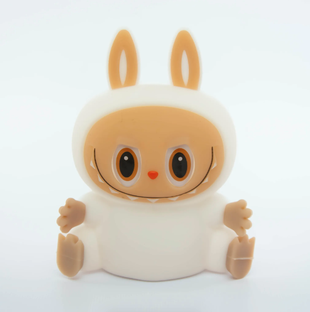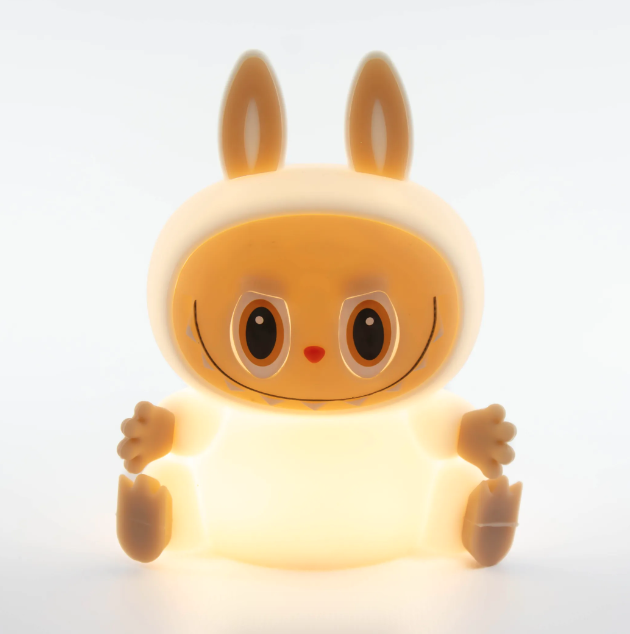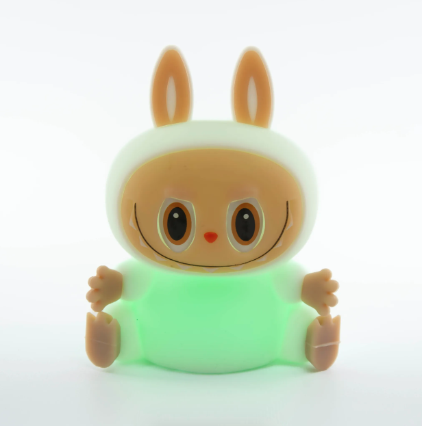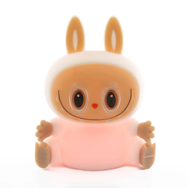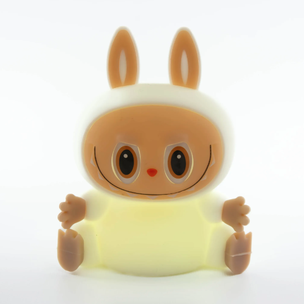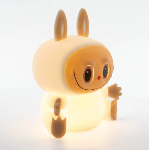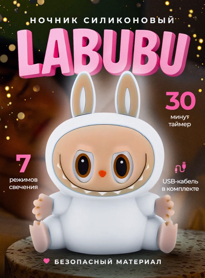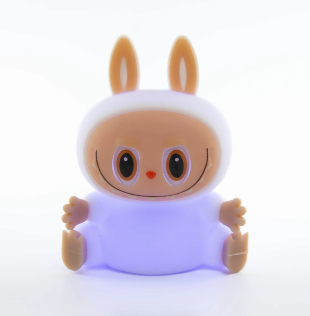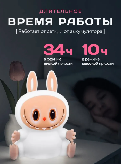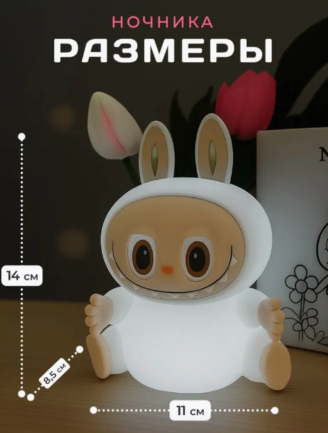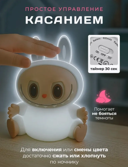 Беспроводной ночник выполнен в форме ультра модного персонажа Labubu, что делает его не только источником света, но и оригинальным элементом декора. Мягкий тёплый свет успокаивает и помогает подготовиться ко сну. Управлять ночником легко — достаточно просто прикоснуться к нему. Это удобно для детей от 1 года.