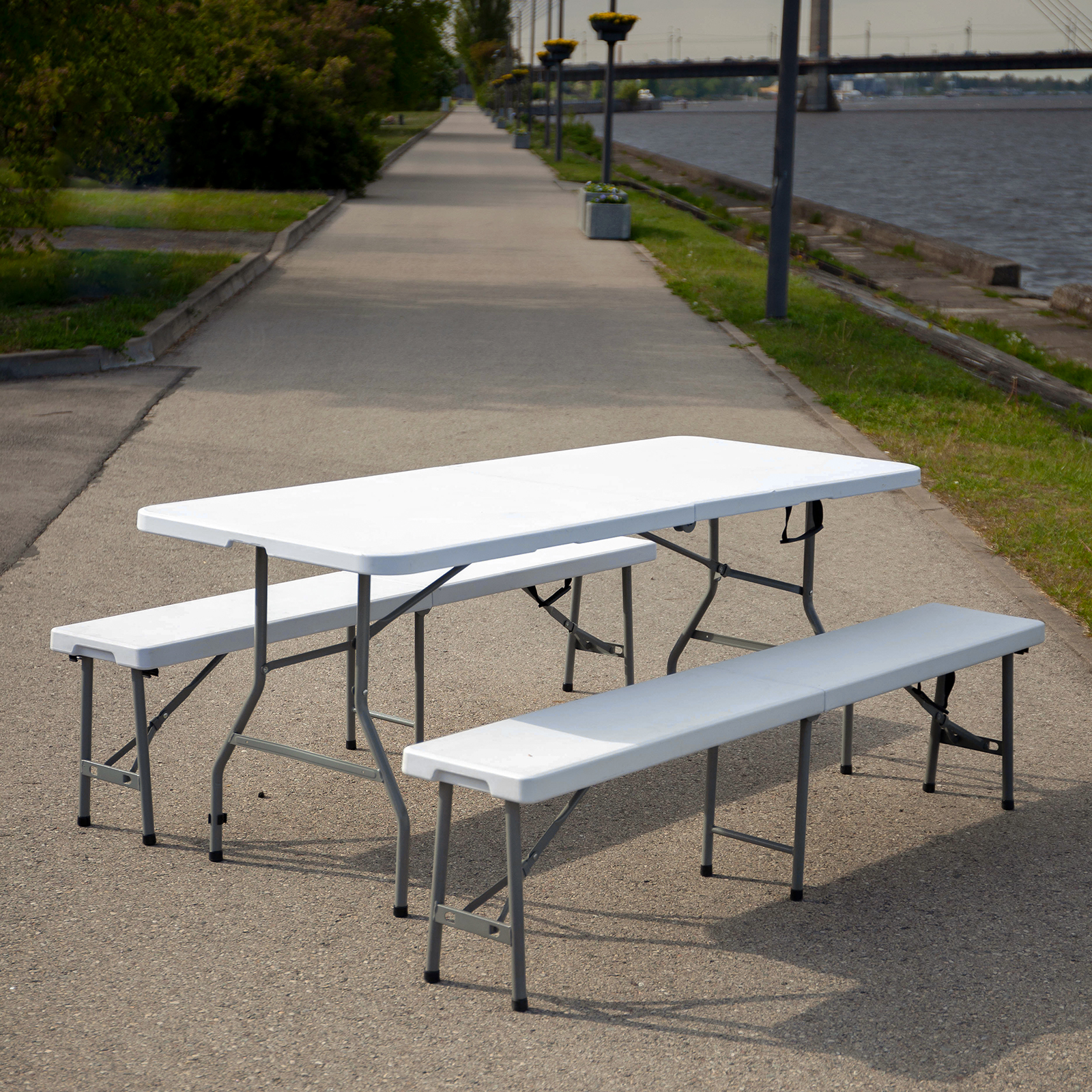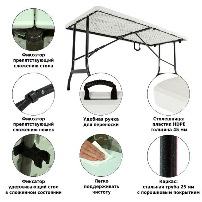 Складной стол-книжка из высокопрочного пластика - это практичная деталь для оформления зон отдыха на свежем воздухе. Его можно установить на веранде, в саду или летнем кафе. Прекрасно подойдет для пикника и рыбалки. Главный плюс - складная конструкция, при хранении стол занимает минимум места, может быть подвешен на стену или поставлен в просвет между стеной и шкафом. Складывается и раскладывается легким движением руки. Устойчив и не скользит по полу благодаря пластиковым наконечникам на ножках.