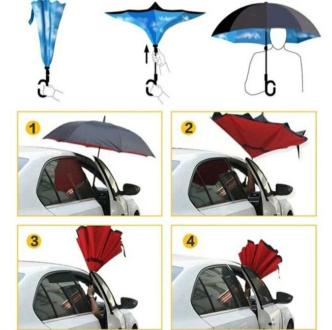 Зонт,который дальше покоряет своей особенностью окружающих. Зонт- наоборот, последнее время идёт уверенно в массы, покоряя окружающий своей необычностью. Но,что же в нем особенного? Ну во- первых, это механизм складывания зонта. Внешняя сторона купола ненамокаемая во время дождя, при складывании оказывается внутри и зонт совершенно сухой. Во- вторых,несомненно плюс в особенности, это то что зонт может стоять на ножке. Эта позволяет компактно сушить или хранить зонт в любом помещении. В-третьих, удобная ручка. Благодаря своей форме,зонт удобно носить. Ручка позволяет при необходимости освободить руки. Четвертое, это водоотталкивающая ткань, которая обеспечивает сухость зонта в сложенном виде. Спицы скрытой под двухслойным покрытием ткани. Несомненно это очень эстетично и привлекательно. Пятое, полуавтоматический механизм. Ну и конечно внешний вид зонта. Яркая расцветка внутри, особо поднимае