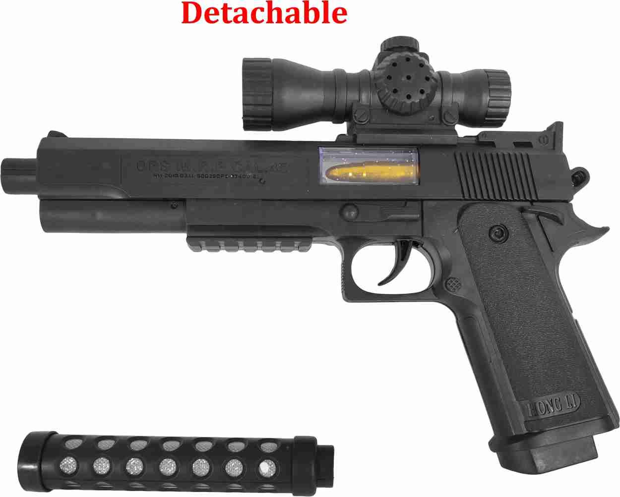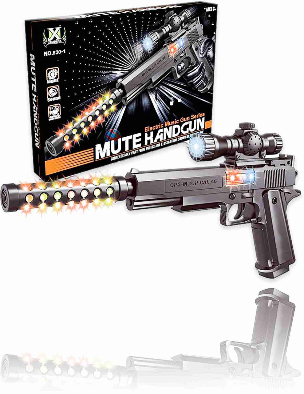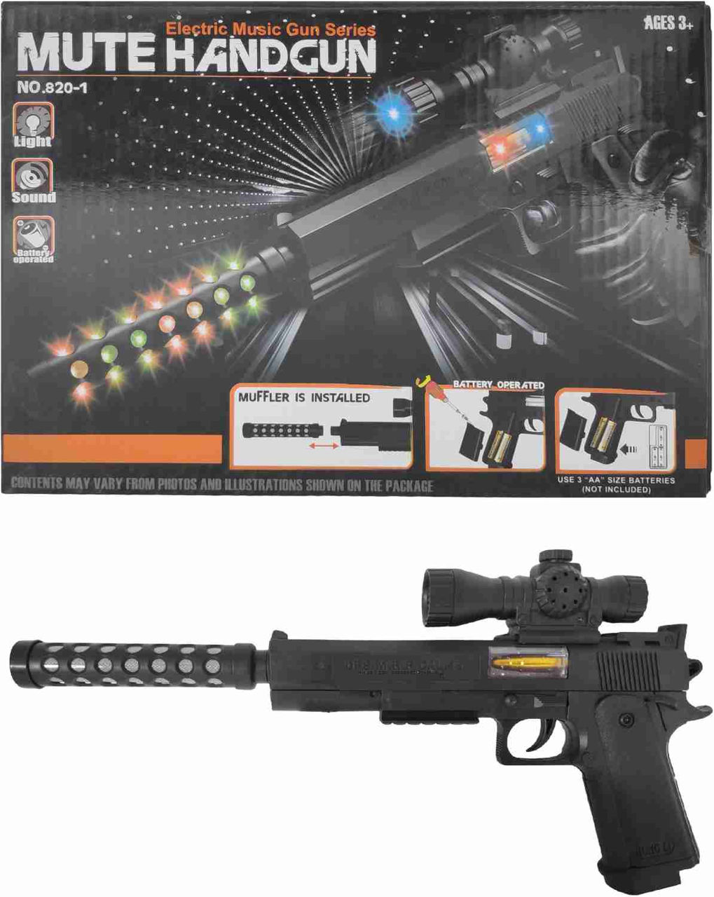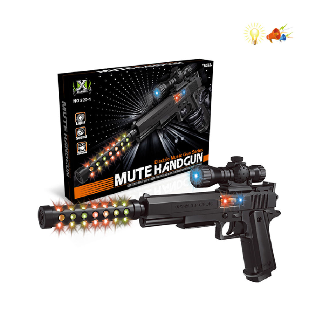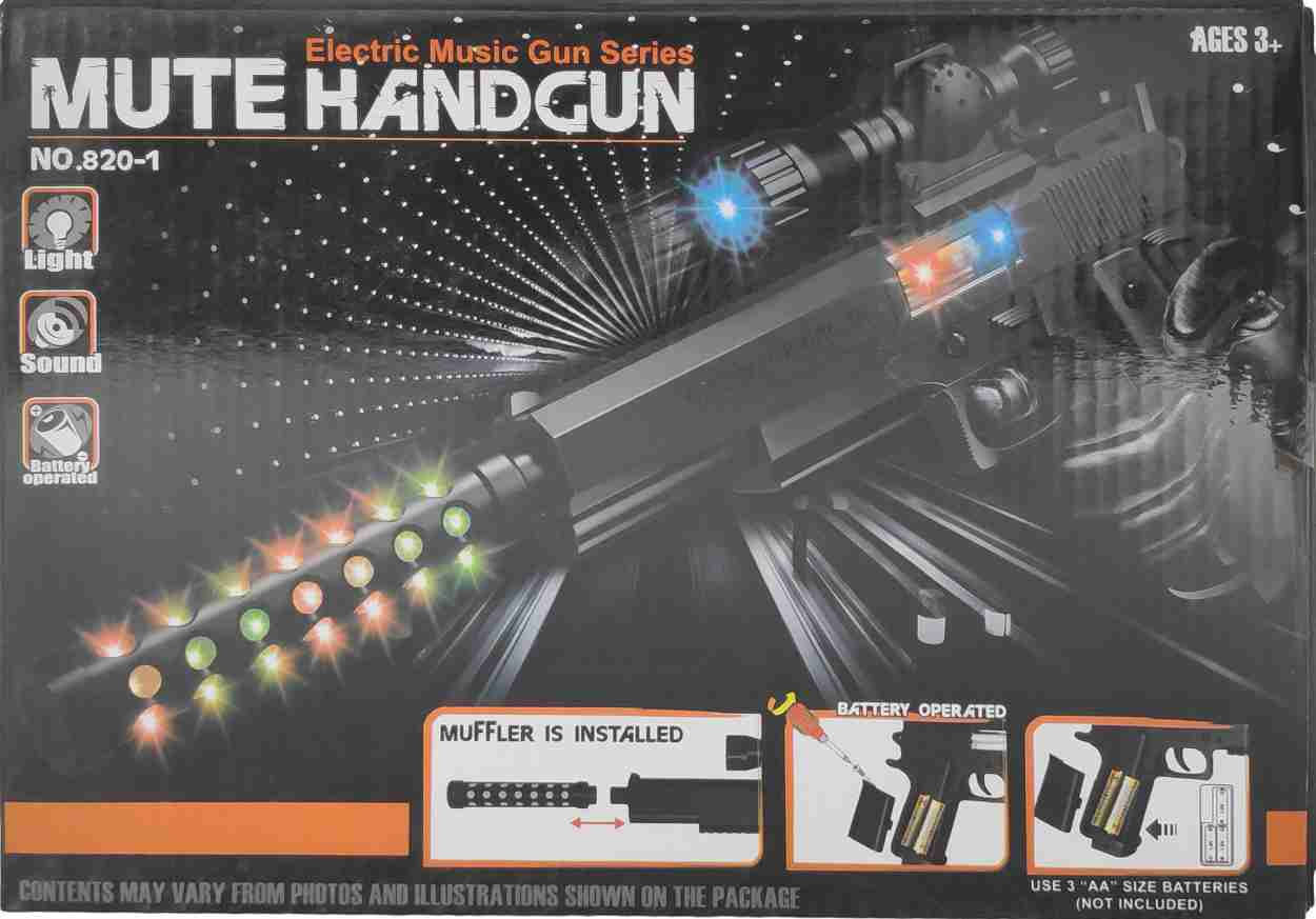 Игрушечный пистолет Mute Handgun 820-1 это реалистичное детское оружие, которое прекрасно подойдет для игры в защитников, супергероев, спасателей. Характеристики: - Игрушечный пистолет изготовлен из качественного пластика и имеет оригинальный вид. - При работе пистолет издает реалистичные звуки, светится глушитель и работает лазерный прицел. - Благодаря эргономичной рукоятке пистолет удобно размещается в детской руке и не выскальзывает. - Пистолет работает от 3-ех батареек типа AA, которые приобретаются отдельно