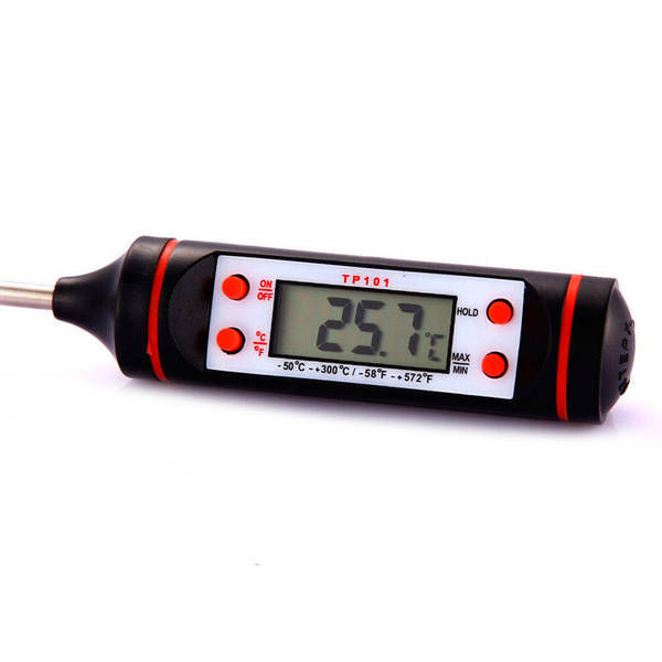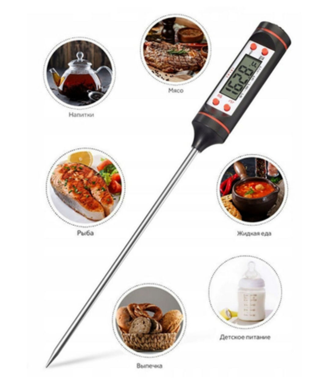 Кулинарный термометр с металлическим щупом JR-1 незаменимый помощник на кухне. Благодаря термометру Вы можете узнать точную температуру блюда внутри, не разрезая его. Широкий диапазон измерений от -50 C до 300 C. Как использовать: 1. Включите прибор нажатием на кнопку on, 2. Аккуратно проткните блюдо заостренным концом до середины, 3. Подержите прибор внутри несколько секунд, 4. Снимите показания с цифрового табло. Преимущества кулинарного термометра JR-Большой диапазон значений,- Высокая скорость измерения,- Большое цифровое табло,- Длительная работа без зарядки,- Единицы измерения по Цельсию и Фаренгейту,-Функция автоматического отключения при простое. Кулинарный термометр JR-1 упростит приготовление блюд и уменьшит риск отклонения от рецепта. Еще одной удачной функцией термометра является проверка температуры напитков. Изделие поможет охладить напитки до нужной температуры, а горячие, наоборот, подать именно горячими, не дожидаясь их остывания. Длина иглы: 14,5 см.