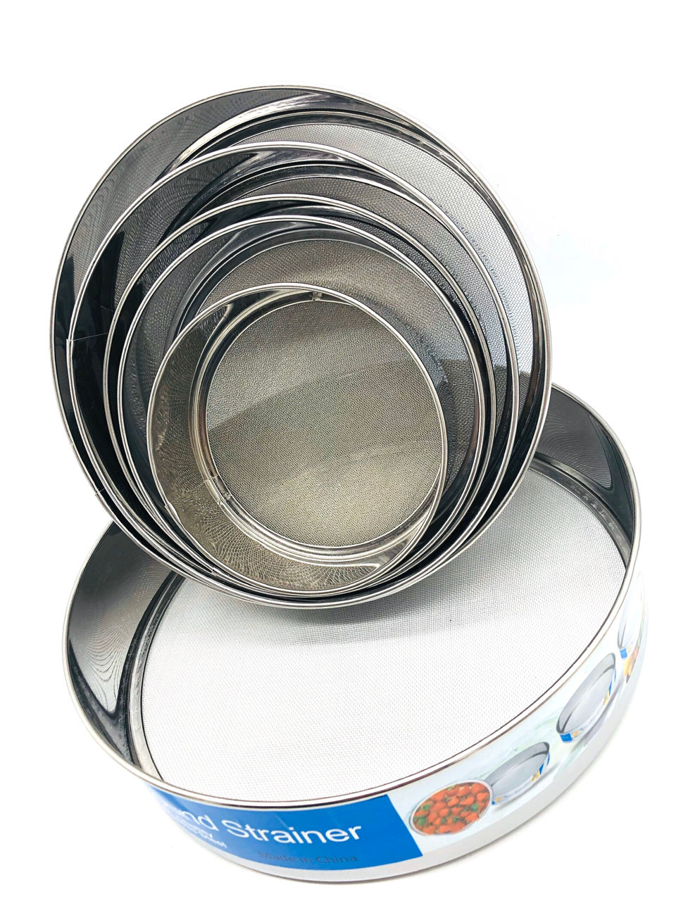 Набор из 6сит разного диаметра с жесткой сеткой. Удобен для приготовления кулинарных шедевров. Изготовлены из высококачественной нержавеющей стали позволят просеять муку, какао, крахмал, сахарную пудру ,а также процедить мясной, рыбный бульон. Нержавеющая сталь не вступает в реакцию с пищей во время эксплуатации, а значит не меняет ее вкус и запах. Товар является прочным и долговечным. Легко очищается даже в прохладной воде. Набор столовых сит удобно хранить, так он занимает минимум места Диаметр :26,5см 23,5см, 20,5см, 19см, 17см, 15см. Материал : нержавеющая сталь Комплектация : 6шт сит.