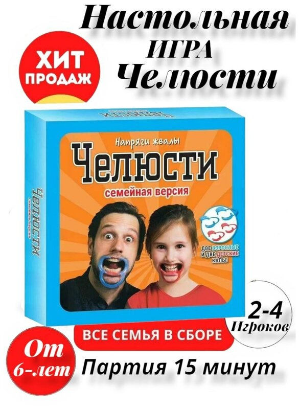 Нет ничего важнее семьи. Абсолютно зубодробительная (иногда даже в прямом смысле) игра, в которой капа стоматолога используется в качестве усложнения. Чтобы вы смогли задействовать в игровом процессе младших членов семьи, издатель выпустил версию, где две капы стандартного размера, а две капы - для детей. Ну, для сравнительно меньших ртов. Набор, знаете, для такой стандартной семьи с рекламного плаката - счастливые мама с папой и два радостных ребенка. Открывай ротик, летит самолетик. Помните правила "Челюстей"? Вставляете капу в рот и пытаетесь что-нибудь сказать. Или спеть. Выходит очень странно, но очень смешно. Будьте осторожны - по слюноотделению вы сможете перегнать любого бульдога. За каждое выполненное задание вы будете получать очки. В игре семь типов заданий. Можно выполнять их в одиночку, всей толпой, или даже бросить вызов самому борзому игроку.