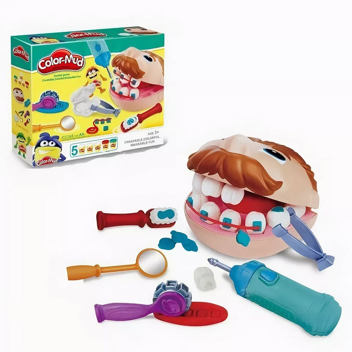 <blockquote>Масса для лепки Color-Mud. Мистер Зубастик<br>Характеристики и описание<br>Описание<br>Еще никогда поход к стоматологу не был таким веселым! С помощью Play-Doh и собственного воображения можно лепить зубы и ставить брекеты, чтобы у ваших пациентов была идеальная улыбка! У пациента «дырка» в зубе? Поставьте пломбу, используя нашу бормашину со звуковыми эффектами! И не забудьте почистить зубы! Наличие батареек: Внимание!!! не входят в комплект!!! Тип батареек: 2 х AA / LR6 1.5V (пальчиковые) - в бормашинку.<br>Общие характеристики<br>Тип: масса для лепки<br>Количество цветов: 5<br>Вес: 280 г<br>Застывающий: да<br>Возраст: от 3 лет<br>В комплекте: инструменты для лепки, формочки<br>Пол: унисекс<br>Подробная комплектация<br>- игрушечная голова пациента Мистера Зубастика;<br>- стоматологические инструменты;<br>- аксессуары;<br>- 5 баночек пластилина <span style="font-size: 1rem;">Color-Mud</span><span style="font-size: 1rem;"> (белый - 3 шт., красный, синий).</span></blockquote>